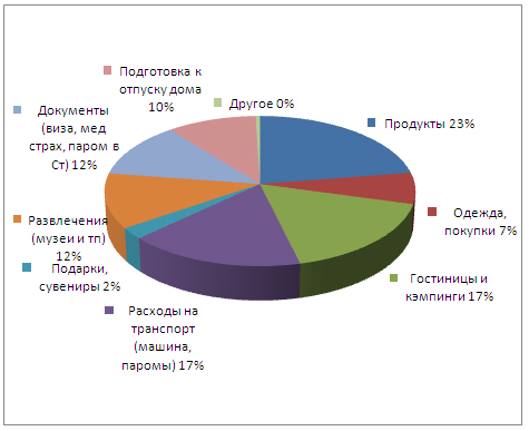 Бюджет поездки составил 170000руб (это включает все расходы, начиная с расходов по подготовке — закупки недостающего снаряжения, виз, страховок, бронирования и расходов непосредственно в самой поездке). Эти деньги распределились следующим образом – см. диаграмму ниже. Т.е. основные расходы – это питание, проживание, бензин и паромы, музеи и билеты в экскурсионные места, потом все остальное.