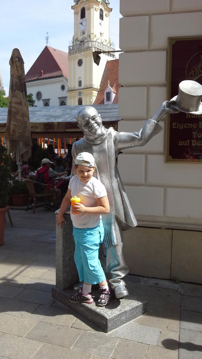 Здесь на Главной площади проходят часто многочисленные концерты, музыкальные фестивали, вот и сейчас шла подготовка сцены.А народу в этом месте действительно много, идет бойкая торговля сувенирами в память о посещении словацкой столицы.Рядом со Старой Ратушей находится Городской музей и Примациальный Дворец. Времени у нас на посещение центра города было ограничено и мы не стали задерживаться и пошли дальше. По пути встретили забавные скульптуры и памятники: