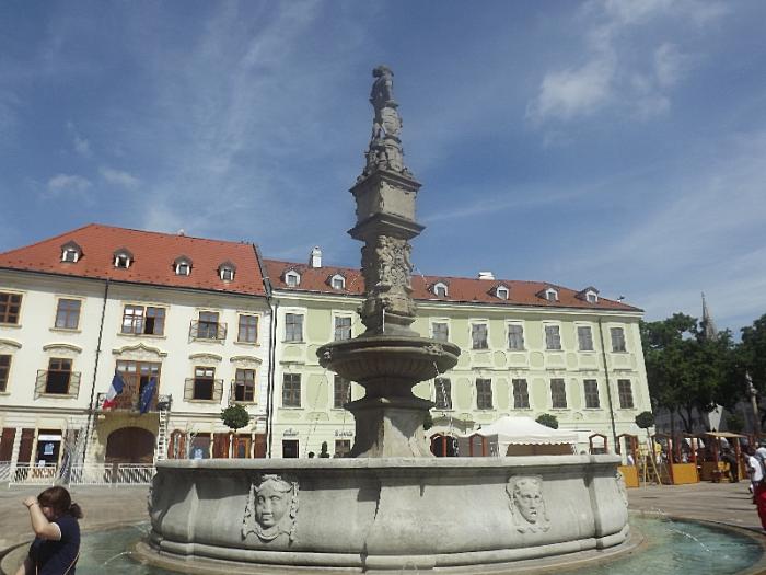 церковь капуцинов св. Стефана 18 века с каменным столбом, на котором расположена Мадонна.Рядом есть фонтанчик с вкусной водой, что в такую жару прямо освежила нас. Мы заканчиваем свое маленькое путешествие по Братиславе на Пл.Ходжаво, где расположен Президентский дворец. Там в настоящее время расположена резиденция президента страны.Если флаг вьется на крыше дворца, значит в настоящее время президент находится в стране.Время нас поджимало и ближе мы подходить не стали, да и утомились мои девушки довольно сильно, Жара то нешуточная.