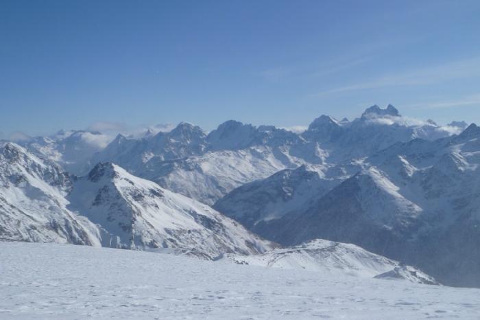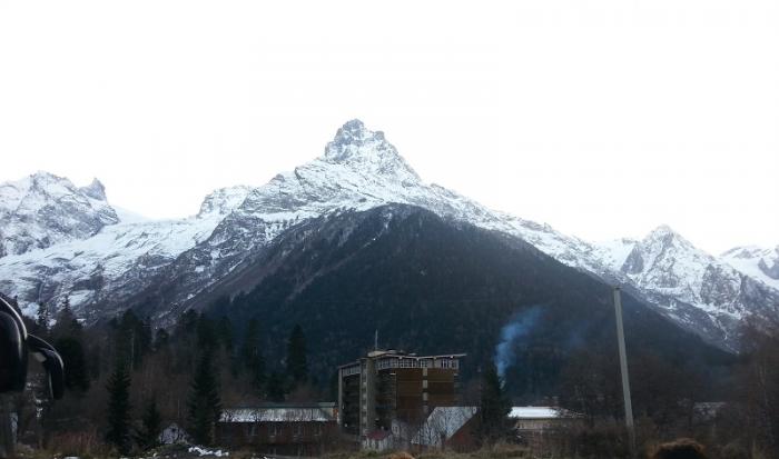 и длится весь день, стоит она 1000 рублей плюс еще 800 нужно взять на подъемники. С Ессентуков до Домбая примерно 220 км и 3 часа в пути. В среду в невысокий сезон (а высокий сезон с декабря по март) мы были на этом горнолыжном курорте единственной экскурсионной группой. День выдался теплым и ясным, так, что двуглавый Эльбрус провожал нас добрую половину пути. Гидом у нас была Яна – замечательная во всех смыслах женщина, активная, энергичная и очень вкусно рассказывающая. Мне повезло провести с ней все экскурсии еще в прошлую поездку, поэтому увидев ее вновь, я поняла – поездка удалась. Автобус у нас был большим и комфортабельным, а группа занимала только его половину.