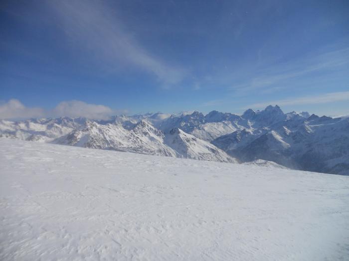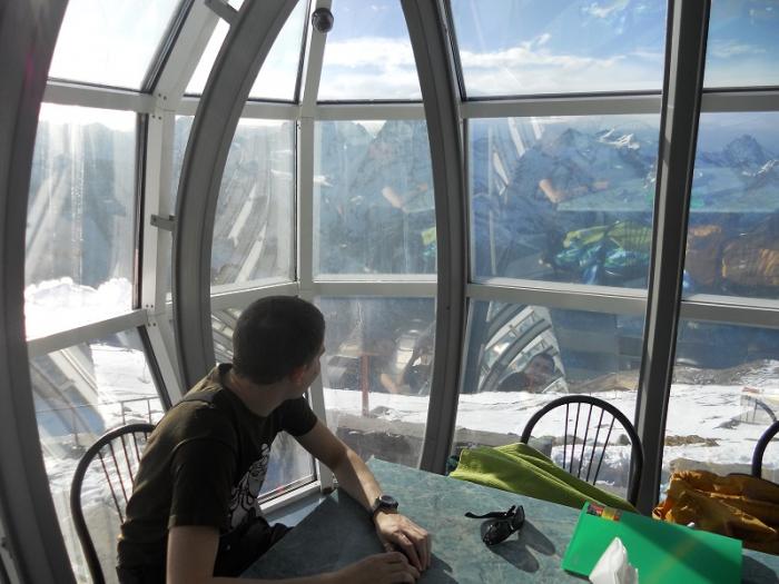 Через полтора часа мы отправились на долину Азау – подножие Эльбруса. Стоить отметить еще и то, что с погодой нам в этот день также не очень повезло. Солнце, светившее всю неделю, спряталось под тучи, да и снежок пошел как-то совсем не вовремя. В итоге, поднявшись на высоту 3500, мы вершины Эльбруса так и не увидели.