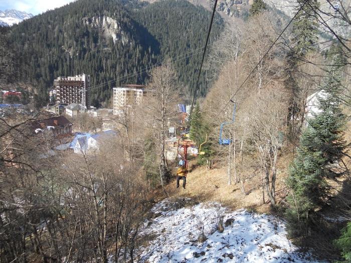 Подняться на нее было решено на открытых подъемниках: сначала на одноместных, затем до высоты 2277 – на двухместных, а выше – уже на шестиместных. Есть более спокойная альтернатива подъема на высоту 2277 – капсульные подъемники, они и двигаются быстрее, да и для тех, кто боится высоты, в них намного уютнее. Я же высоты совсем не боюсь, поэтому получила невероятное удовольствие от того, как срезанные макушки деревьев почти щекотали мне пятки. Подъемники стоят вкупе 800 рублей, это вместе со спуском. Подняться можно и выше, на 3200, если не ошибаюсь, за это нужно дополнительно заплатить, но выше ездят в основном только отчаянные сноубордисты.
