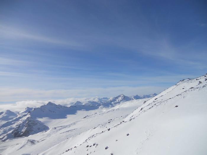 С высоты 3012 метров открывается потрясающий вид на живописную Домбайскую поляну, расположенную на соединении трёх главных ущелий: Алибека, Аманауза и Домбай-Ульгена.