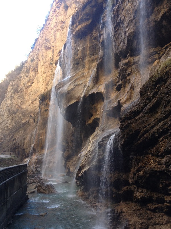 На следующий день у нас вновь была запланирована дальняя поездка. На этот раз – на Чегемские водопады (стоимость – 1000+250 рублей). Нас опять забрали в 8.30, но на этот раз из-за малого количества туристов нам дали микроавтобус Мерседес – не менее комфортабельный, чем автобус накануне. На этот раз нашим экскурсоводом был Евгений, под рассказ которого хотелось уснуть, уж больно неинтересно он все рассказывал. Итак, нам предстояло сделать несколько переездов, первыми в очереди были Чегемские водопады — группа водопадов на реках Адайсу, Сакал-Туп и Каяарты, впадающих в реку Чегем. Они считаются одним из природных туристических достопримечательностей Кабардино-Балкарии. Водопадов всего 3, нас же привезли к Большим Чегемским водопадам, которые находятся в пределах Чегемской теснины