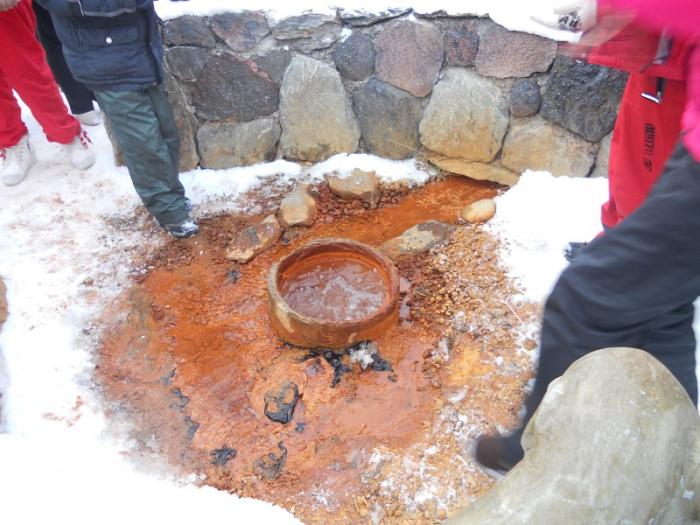 Конечной точкой этого нашего путешествия стали термальные источники (именно для въезда на территорию источников и собирают дополнительные 250 рублей). Вода в бассейне 38 градусов, очень приятная температура, особенно когда на улице прохладно. Вылезать совсем не хочется, но находиться в воде рекомендуют не более 20 минут. Переодеться можно в теплой и холодной раздевалке, теплой, в основном, пользуются женщины. Там же мы и отужинали: нас накормили местным как-то по-особенному копченым мясом и напоили травяным чаем. Не сказать, что мы были в восторге, но вполне сытно.