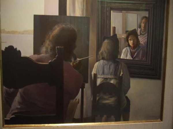 Три этажа, из коридоров виден центральный зал сверху – в нем кадиллак их любимый с Гала, и на нем огромная бабища-Венера в македонском шлеме тянет цепями столб. На столбе лодка, с нее свисают капли. В общем, впечатляет…. Картины огромные двойного изображения – особенно интересно их фоткать – смотришь глазами – голая женщина стоит спиной – смотришь в фотик – это нос на портрете…