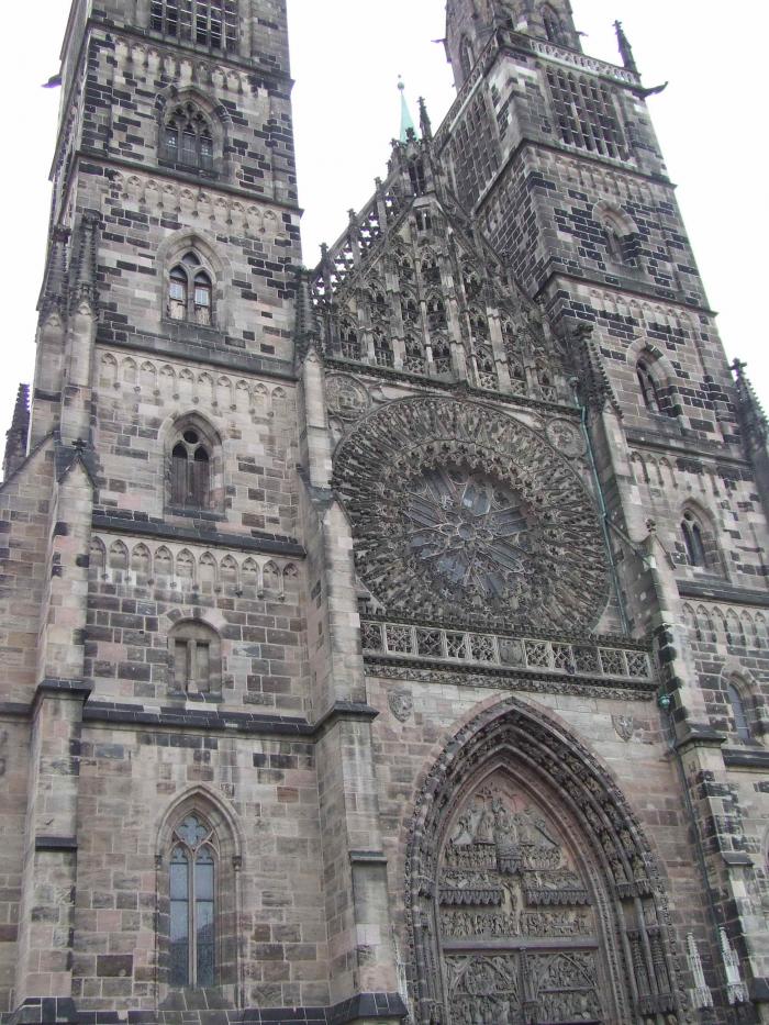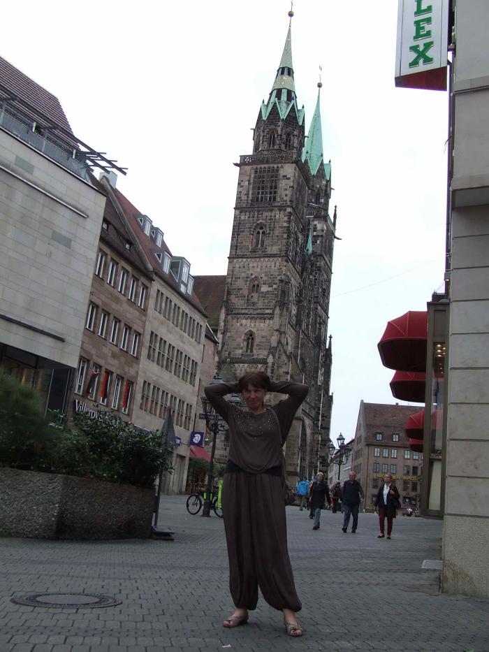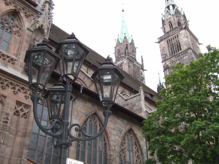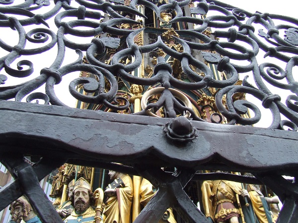 Площадь Нюрнберга, как известно из источников, была построена на месте сожженного еще в 14 веке еврейского квартала, а знаменитый барочный храм Девы Марии – на месте синагоги. Фонтан на площади известен как шпиль для храма, который так и не подняли на башню, и поэтому, не пропадать же добору, вставили в фонтан. В решетку вокруг этого сооружения впаяно кольцо, которое, по легенде, сделал один подмастерье за ночь, чтобы посвататься к дочери хозяина. Все там у них сложилось, и теперь другим приносит удачу, надо только его потереть и загадать желание, что мы и проделали.
