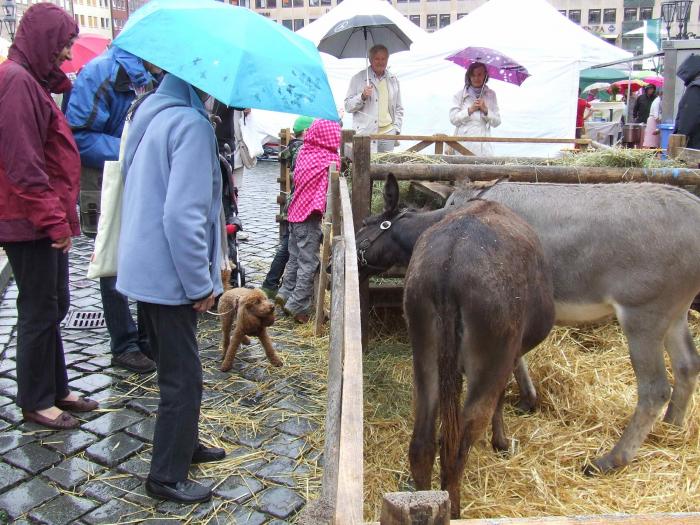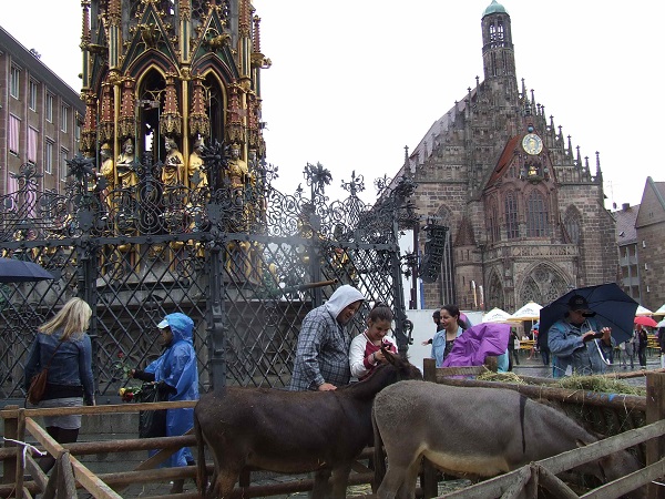 Забавно, что воскресная ярмарка на площади расположила перед дверьми храма павильон с пивом и павильон с сидром. Типа –освежись и помолись… А возле фонтана-шпиля был загон для осликов.