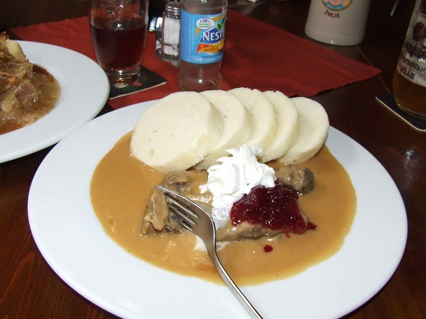 Потом зашли в полупустой ресторанчик Швейка, заказали местного пива и местных блюд. Хоть тут повезло. Чешский гуляш с кнедликами был восхитительный. Я, правда, заказала не гуляш, а что-то еще национальное – и мне принесли блюдо, на котором лежало мясо в подливе, варенье и сливках, и кнедлики, которые макают в подливу – все вместе это было очень вкусно.