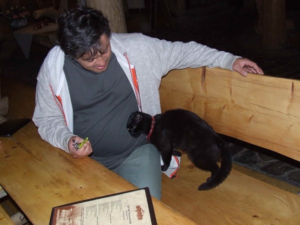 1.07 Проснувшись, я решила, что больше не смогу есть – минимум еще сутки. Но уже на завтраке пришлось вмещать колбасу, яичницу, творог, помидоры, варенки, хлеба и т.д. и т.п. Кот, черный, в красном ошейнике мошеннически ластился ко всем – а на самом деле точно знал, когда принесут завтрак, и что нужно успеть понравиться постояльцам…