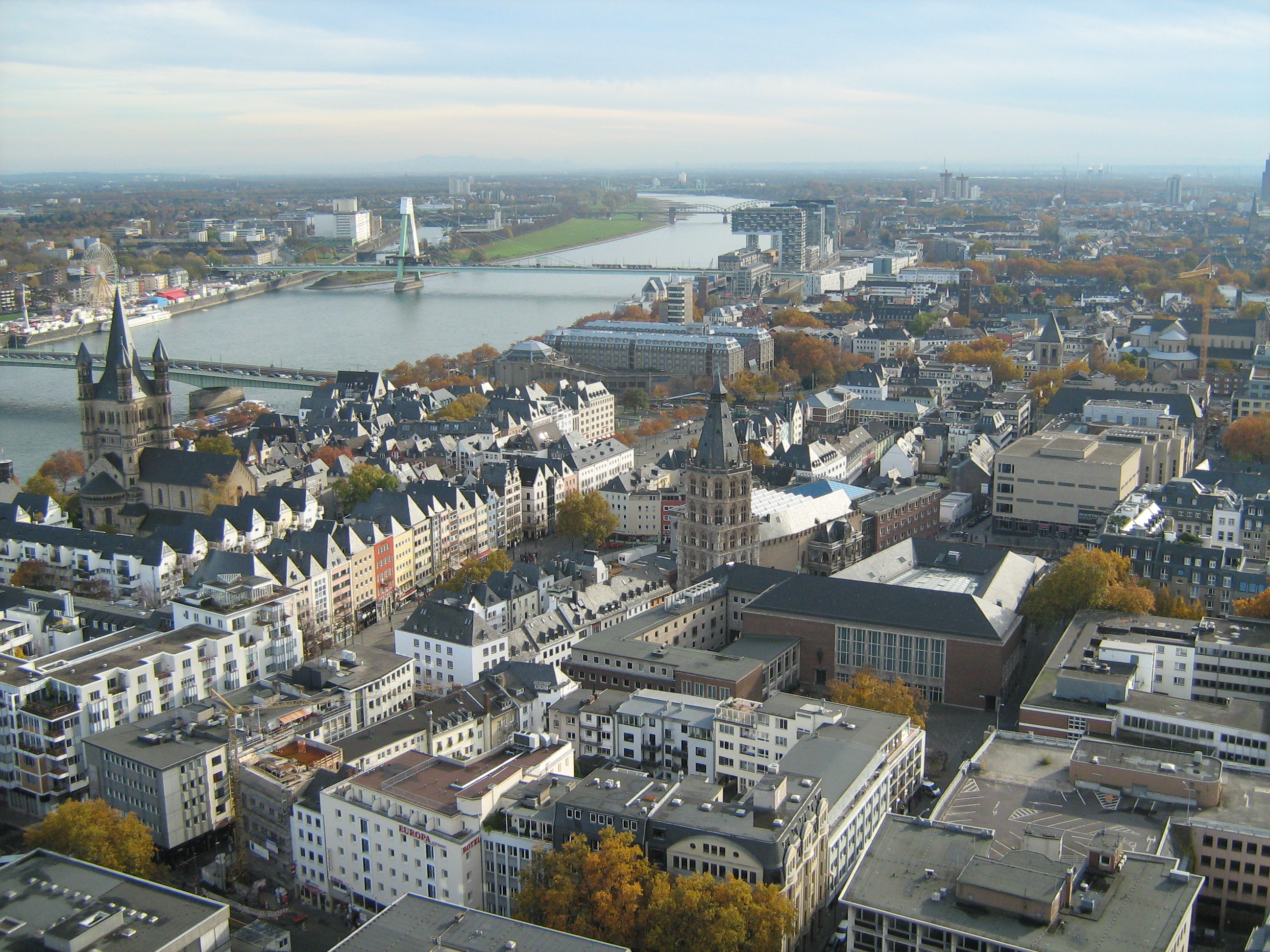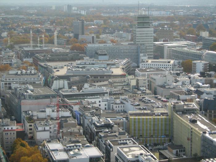 Высота его башен 157 метров. Заплатив несколько (точно не помню) евро, поднялись на смотровую площадку южной башни. Кёльн с высоты птичьего полёта.