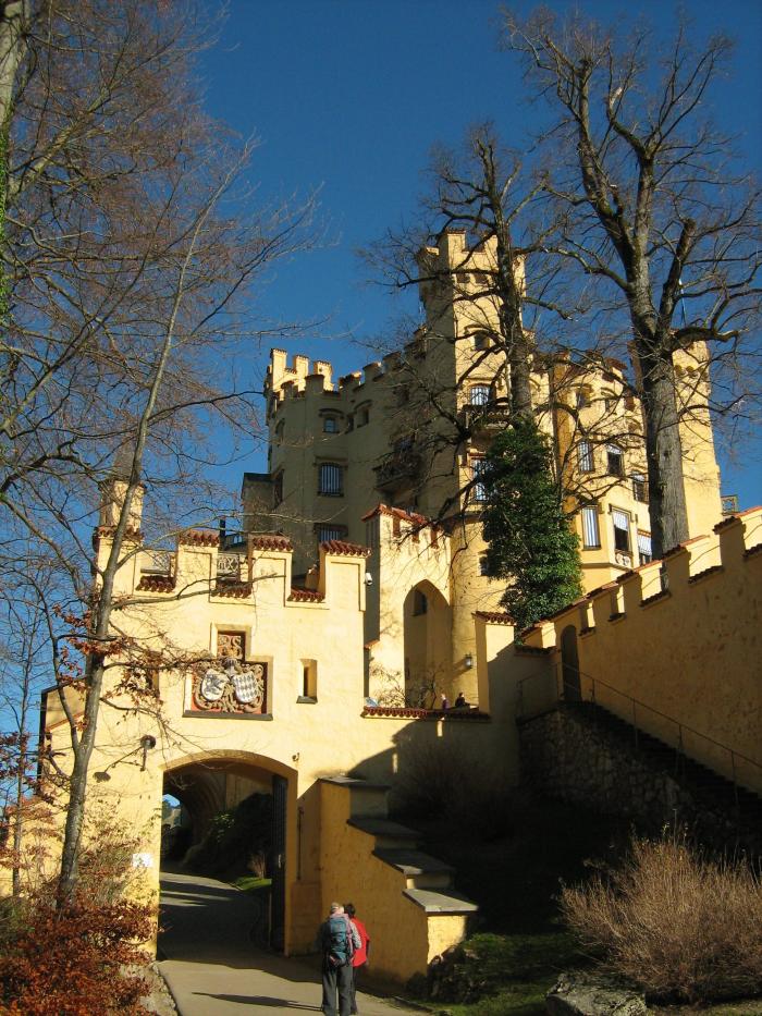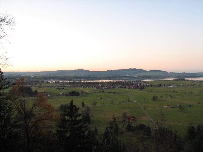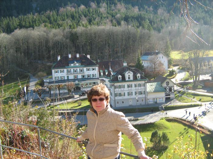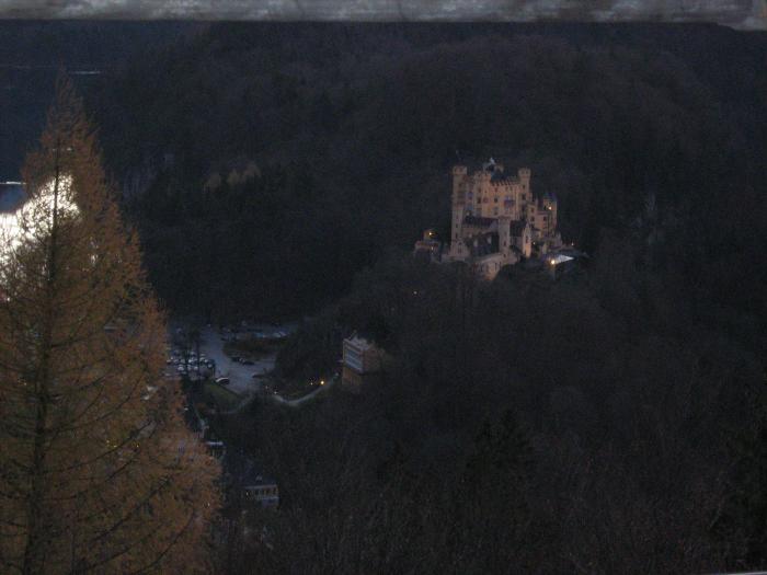 Экскурсия была с аудиогидом. К сожалению с нами была большая группа китайцев, которые галдели непрерывно, хуже итальянцев, всё время фотографировали и снимали на видео за что, сопровождающая нашу группу сотрудница замка-музея, постоянно останавливала экскурсию и требовала прекратить это. Когда мы вышли из замка уже смеркалось. Спускаться решили пешком. Вид на замок Хохеншвангау от замка Нойшванштайн.