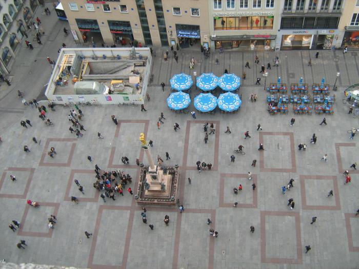 на Мариенплац в одиннадцать часов бьют куранты и одновременно можно наблюдать театрализованное представление из вращающихся фигурок на башне. К 11 часам прибыли на центральную площадь города которая называется Мариенплац. Название ей дала находящаяся в центре Мариинская колонна.