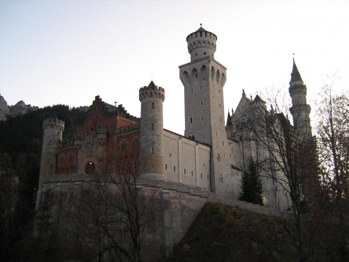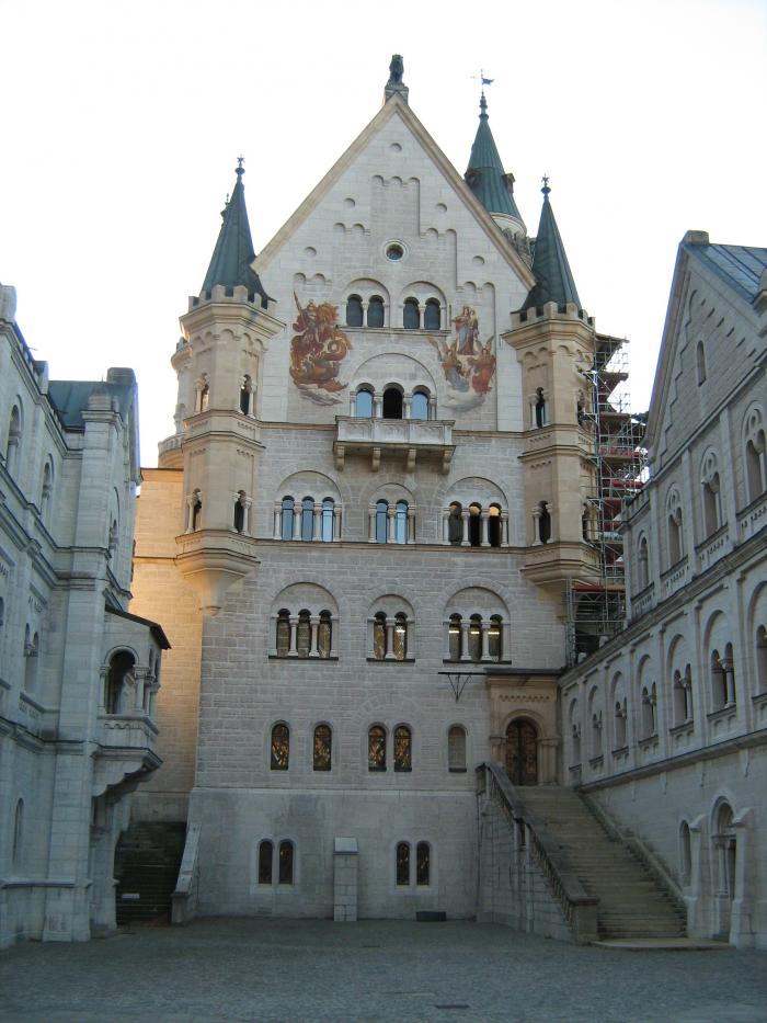 Замок Нойшванштайн (Новый лебединый утёс) начал строить баварский король Людиг 2 в 1869 году, но так и не закончил. После его смерти стройку приостановили. Вид замка из внутреннего двора.