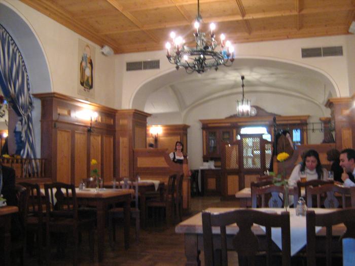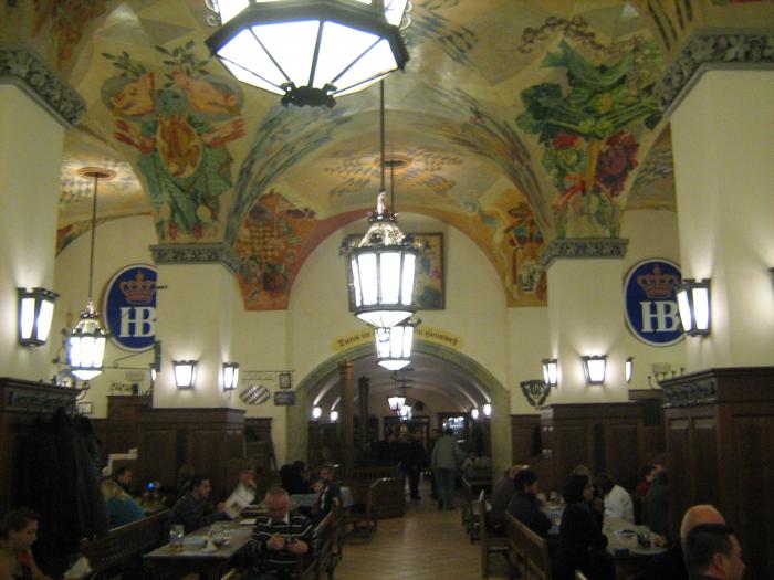 Она была основана в 1589 году и до конца 19 века обслуживала только герцогский двор. Она также знаменита тем, что в 1920 году в ней прошла первая манифестация нацистов. Здесь залы располагаются на трёх этажах. В первое посещение остановились на первом этаже. Это большой зал в традициях немецкой пивной. Есть меню на русском языке. Заказали пиво в литровых кружках