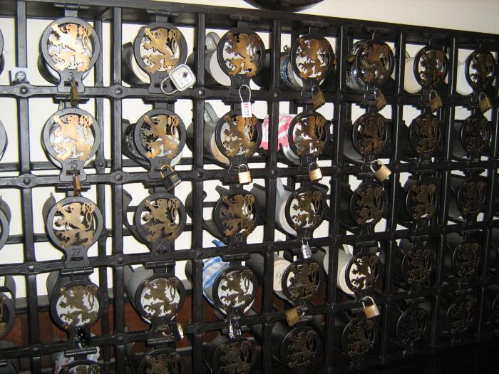По многочисленным просьбам постоянных клиентов в 1970 году из железа был выкован большой сейф с закрывающимися на замок ячейками, в которых завсегдатаи хранят свои личные глиняные пивные кружки. Ячейки в этом сейфе передаются по наследству. В «Хофбройхаус» я эти сейфы не сфотографировал, а эта фотография из ресторана Löwenbräu. Но в «Хофбройхаус» сейфы такие же. Интересно смотреть как по залу шествуют пожилые мужчины в шортах с подтяжками, в шляпах с перьями и важно несут свои личные пивные кружки.