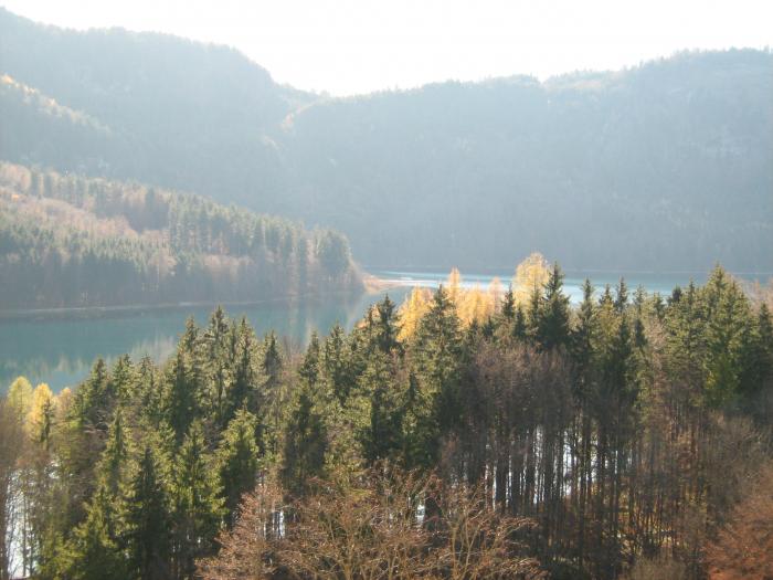 На 9 ноября запланирована поездка в деревню Швангау для осмотра замков Хохеншвангау и Нойшванштайн. Так как ехать туда всего 124 км по дорогам А96 и В17, завтракали не спеша, не спеша собирались, не спеша выехали. При этом не учли, что начало ноября и световой день короткий. Нужно было выезжать пораньше. По магистрали быстро доехали до Ландсберга, а потом свернули на дорогу местного значения и вот показались Альпы.