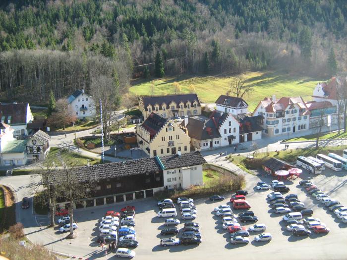 На подъезде к деревне машину оставили на первой же парковке на въезде в деревню, и зря можно было проехать в центр деревни. По указателям прошли к кассовому залу и купили билеты на экскурсии в оба замка с аудиогидами. В Хохеншвангау билет на троих стоил 21 евро, а в Нойшванштайн – 24 евро. Экскурсии начинаются по расписанию. Первая была в замок Хохеншвангау (Высокий лебединый край).