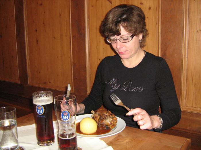 И самый дорогой из них. При этом, что бы не объедаться на троих взяли один суп и два вторых: свиной стейк и полутки (почему-то птица у них подается только по половине). Два поллитровых светлых и два тёмных пива и сыну лимонад. Итог 55,70 евро. Да, и пиво дороже чем в «Хофброе» — 8,40 евро 1 литр.
