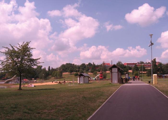 Дошли до небольшого парка с речкой. Бесплатного, хотя на входе стоят турникеты. Нас очень удивило то, насколько чистым и благоустроенным может быть парк. Тут и купаться можно, и детские городки, и для спорта какие-то сооружения, спасатели рядом.