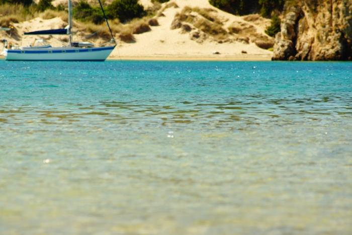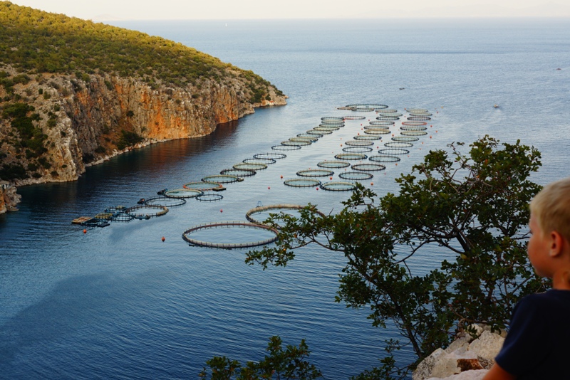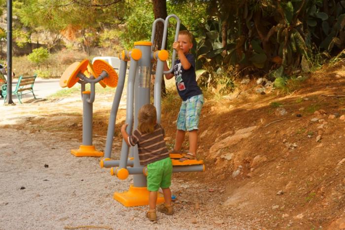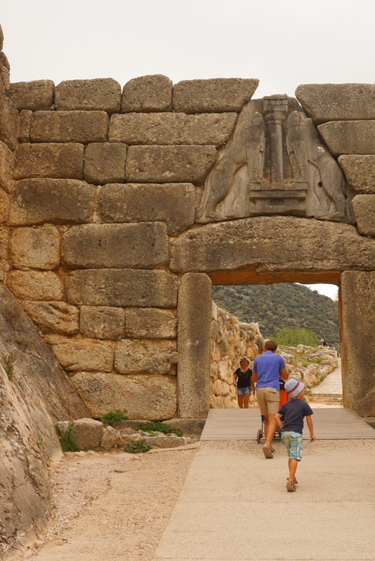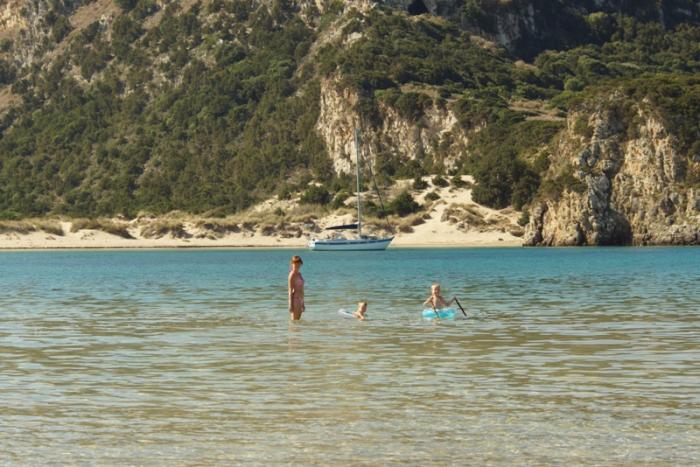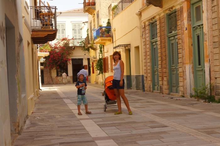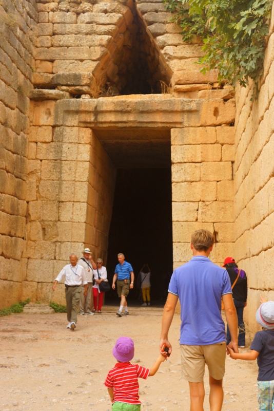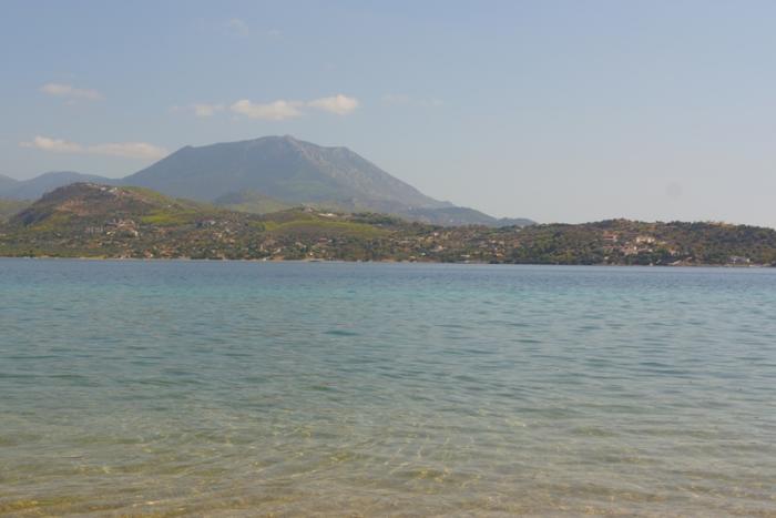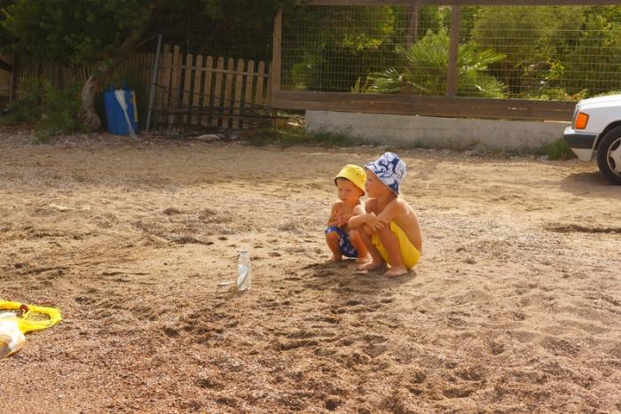 После Микен, поехали на пляж, нашли очень уютное место, задний двор дачного поселка. Тут тоже песчаная полоса 2 метра, но так уютно и совсем нет туристов. Только вот рыбак, ловил сетями мелюзгу и подарил детям одну рыбку в бутылке.