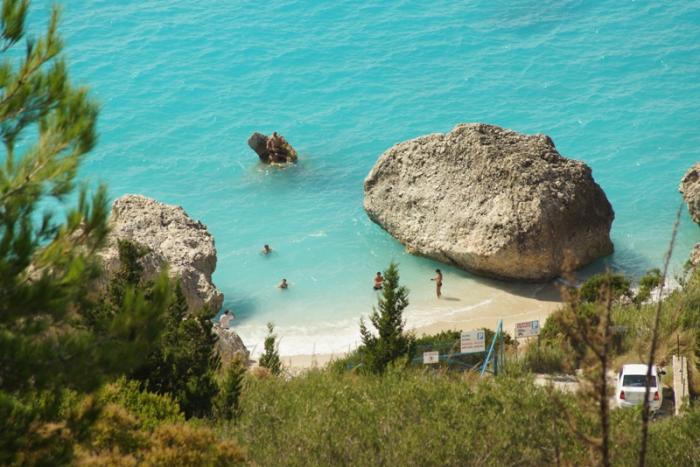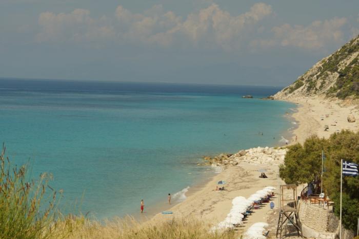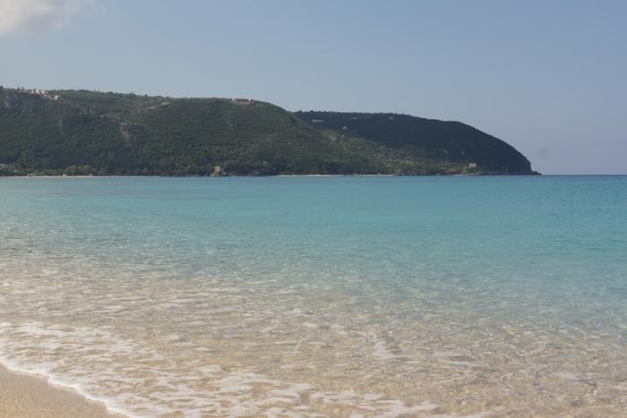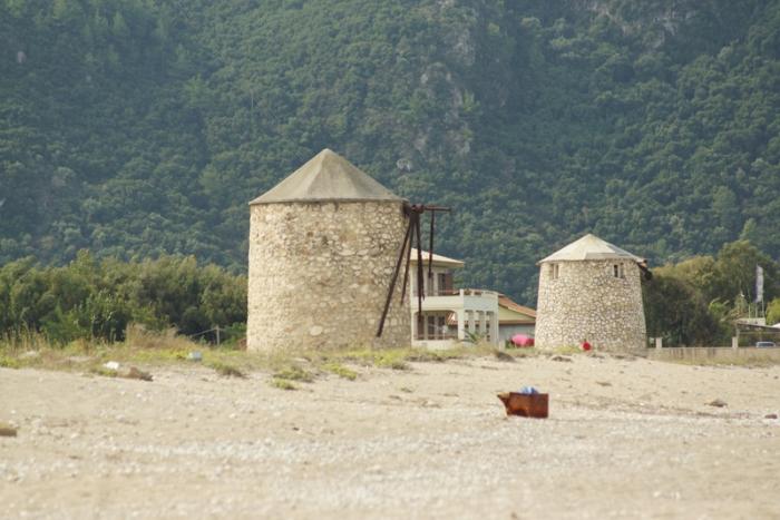 Утром нас ожидал завтрак и дорога до острова Левкада. После Касторьи была автомагистраль, большая, с минимальным трафиком и с очень живописными пейзажами. На участке в 150 км, примерно, насчитали 30 тоннелей от 100 метровых до почти 5 км в длину. Тоннели прорезали горную систему ПИндос. К вечеру приехали на остров, здесь будем жить 3 дня, в местечке Порто Лигиа. Купаться рядом с отелем нельзя, тут лиманы, можно либо углубиться в деревню, либо, как делали мы ездить на косу вначале острова. Там практически нет народа, а пляж огромный. Рядом большая крепость, а на пляже мельницы. Вообще в эту поездку, было огромное количество крепостей, замков, раскопок.
