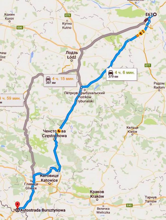 Следующий отрезок маршрута в 380 км- от Варшавы до границы с Чехией – планировали пройти по уже знакомой магистрали S8 E67 до Петрикув-Трибунальского, по магистрали Е75 на Ченстонхова и далее, в направлении Катовице, в окрестностях которого выйти на А1.