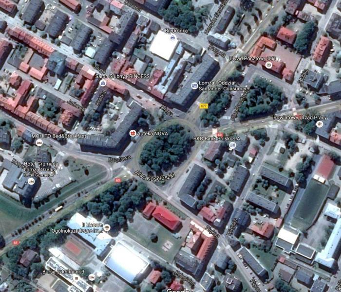 При движении по указателям без навигатора ( да, в общем-то, и при его наличии) особо внимательно следует проезжать Ломжу. В центре Ломжи находится площадь с круговым движением, откуда ведут несколько путей: