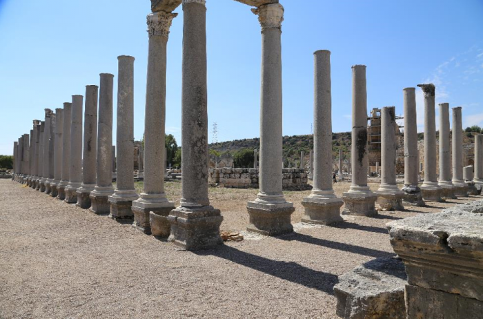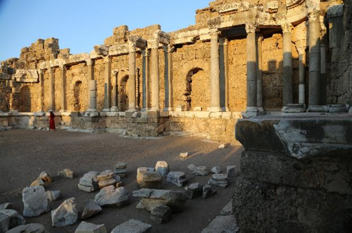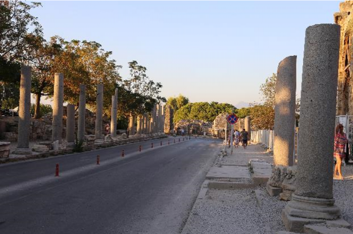 Затем посещаем руины Перге. Огромная площадь строений. Пару тысяч лет назад здесь был прекрасный город. С каналами в центре, широкими проспектами вдоль этих каналов, статуи, колоны, бани, базилики. Воображению есть где разгуляться, когда бродишь по руинам и остаткам строений. При этом город не был разрушен в результате набегов или катаклизмов. Жители оставили его из-за того что местность вокруг стала заболачиваться. А это вариант, ни посеять ни выпасти стада. Вот и разбрелись люди, кто в горы, кто к морю. Город устал ждать население и начал дряхлеть и рассыпаться.