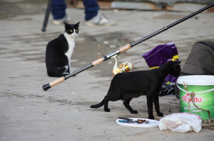Гуляя по набережной, со смехом наблюдали как коты постоянно атакуют уловы рыбаков, тягая у них из ведерок или клеенок рыбу. Сзади каждого ловящего рыбу, сидели 2-3 кошачих надзирателя не сводящих с него глаз. И если тот давал слабину, они мгновенно подчищали его улов.