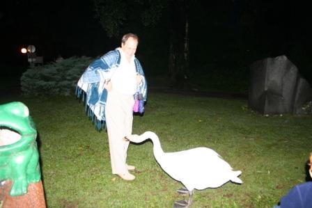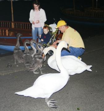 Вечером пошли на прогулку к озеру, где плавают лебеди. Они вели себя уверенно и напористо, пощипали наших мужчин.