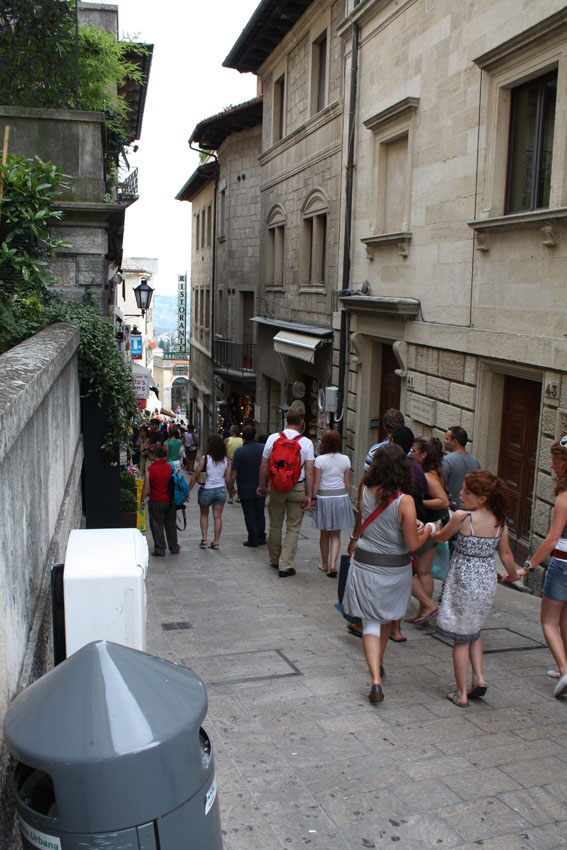 Княжество Сан-Марино является зоной свободной от налогообложения, поэтому все товары достаточно дешевы. В магазинчиках на узких улочках крепости можно купить различные сувениры, спиртное, табак и т.д. Никогда бы не подумал, но и тут среди продавцов оказались наши ребята, что нас повеселило.