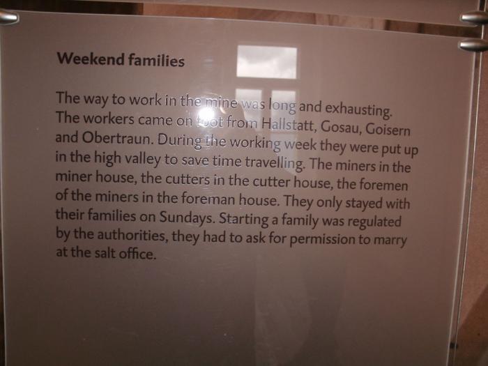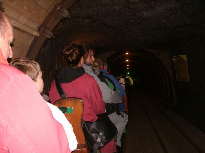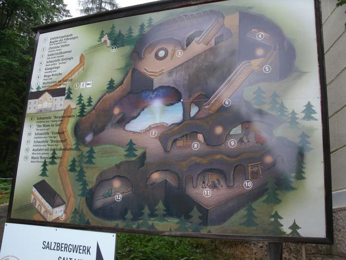 Далее экскурсия проходит по шахте, где рассказывается как добывали соль раньше и как её добывают сейчас. А также различные истории, например, о человеке, найденном в соли. Много веков назад произошёл несчастный случай и один из рабочих, оставшихся в шахте сохранился в кристалле соли и был найден в 1734 году. Кроме того, есть аттракцион — две деревянные горки, по которым всем предлагается прокатиться. Одна из них покороче, другая, 64 метра длиной, является самой длинной деревянной горкой в Европе. Специальная камера измеряет скорость и потом можно найти свои фотографии и при желании выкупить их. Мы не очень там получились, хотя скорость была неплохая — 30 с лишним км/ч.