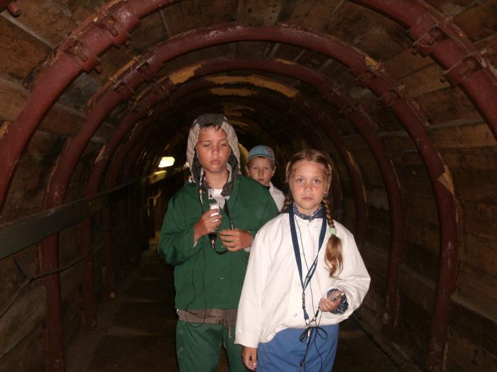 Слушаем начало истории, каждый трек на аудиогиде соответствует столбику с табличкой на пути к шахте. Там же есть описание на английском. И вот уже мы в домике, где все переодеваются в спецодежду. Но, поскольку вход в шахту только группами с отдельным гидом, образуется очередь. Полчаса простояли, а тут ещё привели группу каких-то итальянцев без очереди. Ещё полчаса. Но вот и мы тоже попадаем в группу и переодеваемся. В самом домике ещё целый музей с рассказами аудиогида.