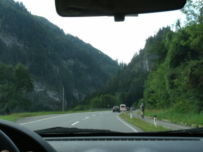 Горные магистрали в Европе это вам не Краснодар-Сочи. Всё продумано до мелочей. На подъёмах, как правило, есть дополнительная полоса, чтобы такие маломощные как мы могли спокойно «тошнить» вверх, не мешая остальным.