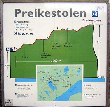 Итак, рассчитавшись за гостеприимный ночлег, в сопровождении и других искателей приключений мы отправились на покорение вершин. Высота самой скалы, которая заканчивается абсолютно плоской площадкой размером около 25 кв.м. 604 метра над Люсефьордом. Высота точки, с которой мы стартовали около 200 метров. Но из-за того, что тропа до вершины несколько раз меняет направление вверх-вниз, суммарная высота подъема больше. А общая протяженность тропы в одну сторону составляет 3800 метров. Вот такие плакаты предупреждают о том, что вам предстоит преодолеть.