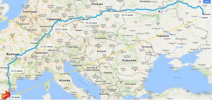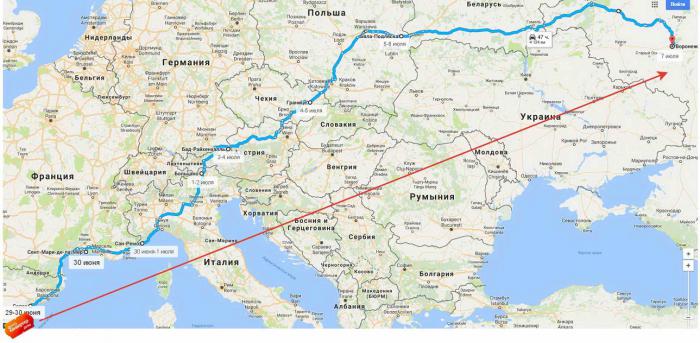 маршрут ТУДА наметился у нас такой: Воронеж-через Брянск — Беларусь, Гомель-Брест, переход Домачево — Польша, Бяла Подляска (отель) — Легница (отель) –Германия, Бад Киссинген (отель)- Франция, Кольмар (отель) – Рокамадур (отель) –Каркассон (посещение)– Испания, Салоу (отель, неделя на море и поездки по окрестностям)