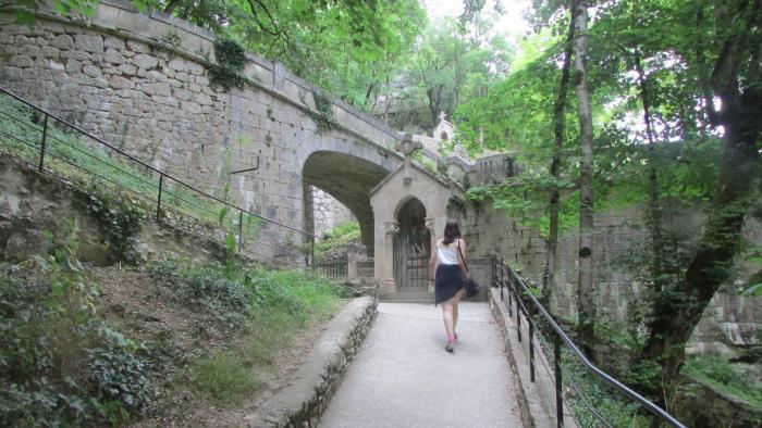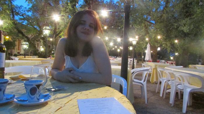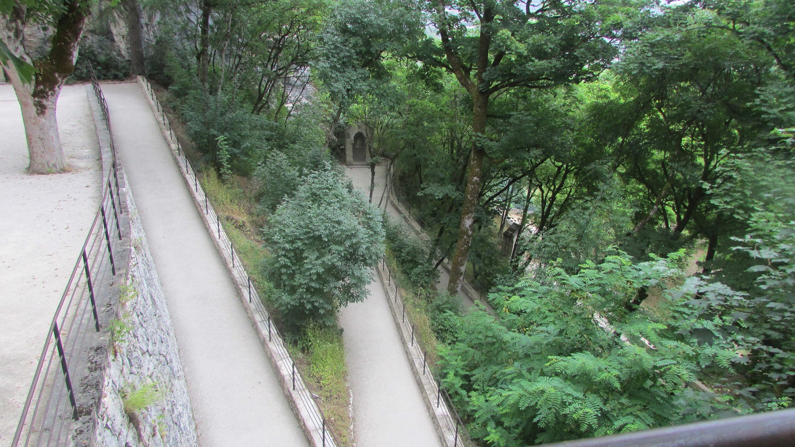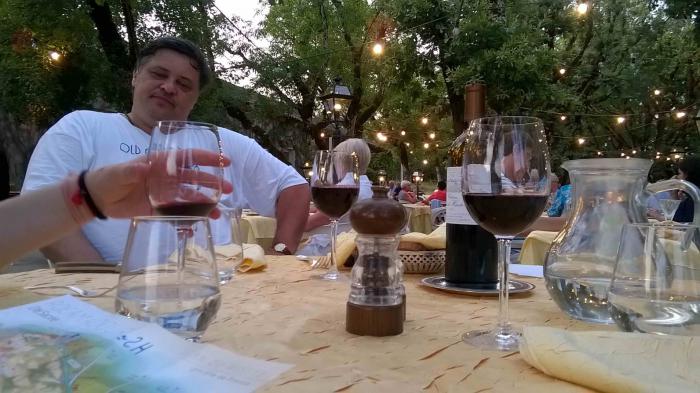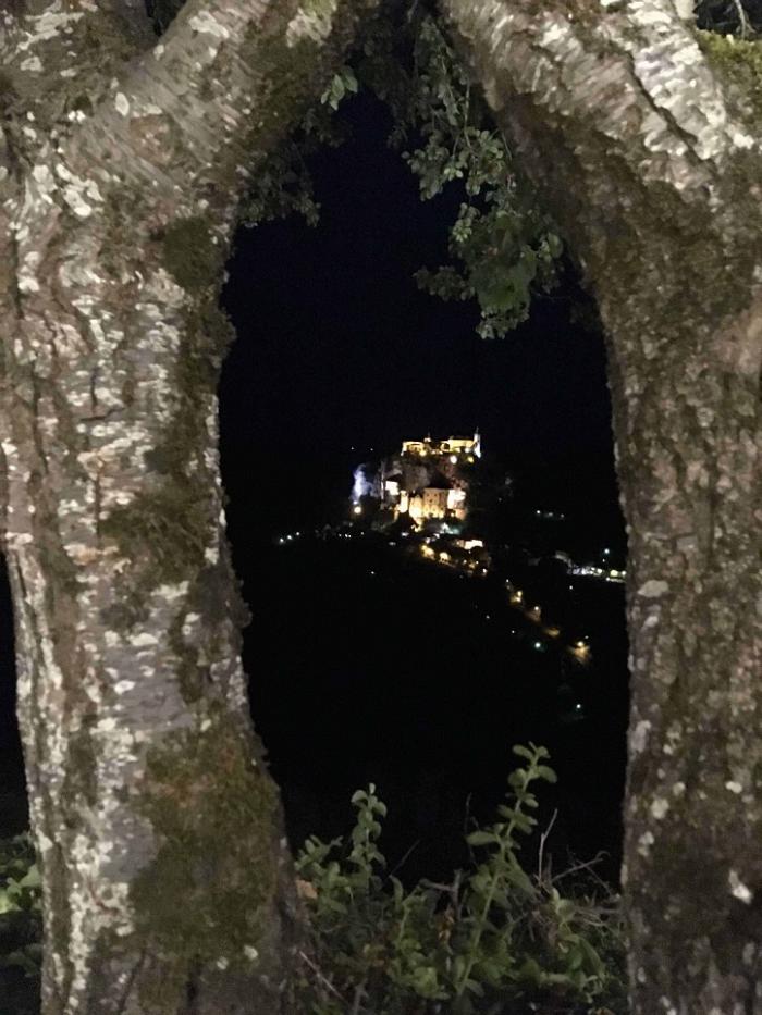 Сегодня был удивительный вечер в Рокамадуре. И само место ни на что не похоже из виденного раньше. Правда, контингент привычный уже — с палочками. Чинно сидели в ресторане на холме под платанами, увитыми гирляндами лампочек, меж ними хромали официанты того же возраста. Все тут пьют только вино, бутылки ставят на стол в пластиковых пакетах с ледяной водой. Вино превосходное. Огромный замок или собор (завтра разберемся) а-ля-ласточкино гнездо — висит на скале в одной стороне – а центр городка в другой, видовая дорога занимает в общей сложности 2 часа, включая подъем по огромной лестнице и спуск в долину. Мы прошлись до городка, вечером тут все подсвечено и картина открывается фантастическая — светящийся в полной темноте замок — собор, в котором, по всем источникам, находится местная святыня, все та же Черная Мадонна, которая оберегает моряков от опасности (при каждом сбережении у нее над головой звякает колокольчик 9-го века, как сказано в проспекте)…