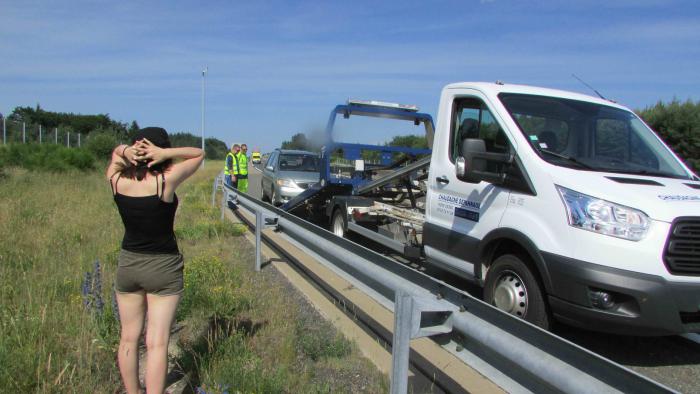 Короче, нам выдали по бутылочке воды, не подпускали к опасной машине, вызвали эвакуатор. Подъехал на нём через 20 минут уже мастер (получается, на техпомощи был просто водитель, типа дежурного менеджера), - осмотрел, махнул рукой — фигня, но в карманах запчастей нет. Короче, погрузили нас на эвакуатор с помпой, со всеми причиндалами ограждения нашего участка дороги. Сбылась моя мечта проехать по Франции с кондеем… (как сказал потом Дима — ты поосторожнее с желаниями, они могут и сбыться… ). Селфи могло быть классным — мы с Дашей в кабине на фоне мазды сверху, в которой Дима. Жаль, Дашка завредничала, не сняла. Зато я снимала погрузку на фотик и с перепугу нажала на эффект рыбьего глаза — и даже не поняла сначала что случилось, подумала сначала, что в фотике линза на жаре расплавилась...