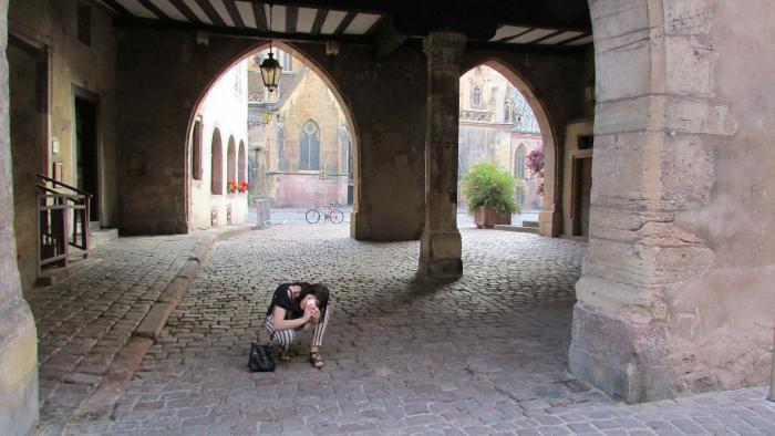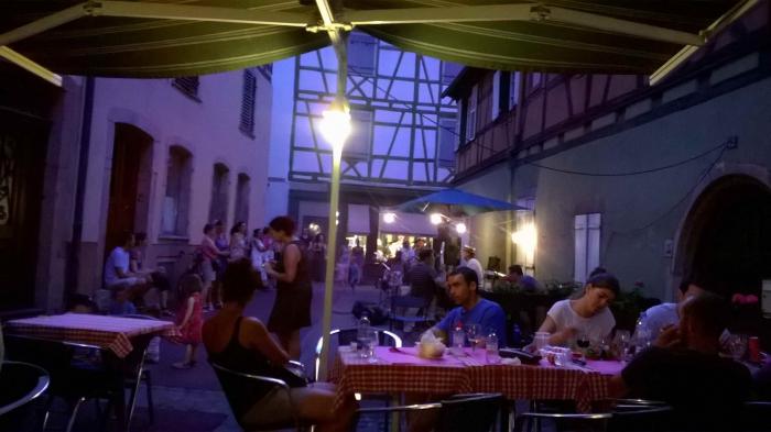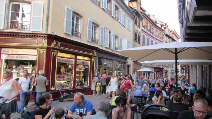 Нам Кольмар плюс ко всему предстал в изнуряющую жару в дни проведения фестиваля уличных ансамблей. Когда мы, уставшие от 6 часов дороги по пеклу, голодные, жаждущие холодного пива, влились в плотный людской поток и были оглушенны рок-джаз-техно-далеевезеде – ритмами со всех сторон, то все (даже я ) пожалели о покинутом баварском Бад Киссенгтоне. Даша заметила: «Почти Венеция: толпы, жара, красота, каналы и папа бухтит». Народ всех возрастов вокруг бродил с фотиками, детьми, стаканами пива, сидел в кафешках, на бордюрах, просто на плитах мостовых. Раздраженные окружением, мы ругались, беспорядочно двигались, примеряли на себя кафе по пути – не то… Наконец нашли то, что устроило всех – в каменном аппендиксе симпатичная кафешка и ансамбль рядом приличный: ударные, гитары, флейта и голоса хорошие. Причем играли вначале что-то наше, вариации типа про «ямщика»… Заказали разное, ткнув пальцем на удачу в меню, которое было только на французском. Мне в итоге досталось нежнейшее фуа-гра на гренках с салатами и жареным картофелем(16 евро), народ попробовал – отказался, предпочли эскалоп в грибном соусе с фри-картошкой и прилагающейся к нему мисочкой салата (12 евро) и что-то подобное. Порции огромные. Впрочем, пока они огромные везде, где мы были.