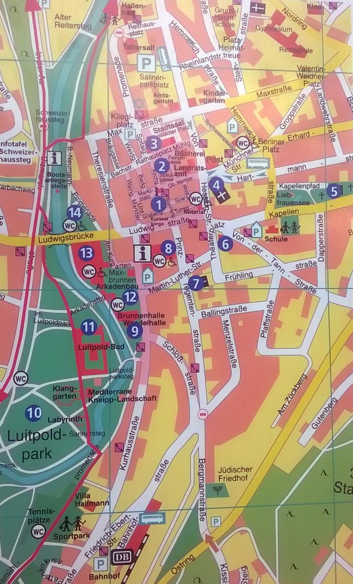 Бад Киссинген — очень известный в Европе курорт, сюда еще до первой мировой ходили поезда из Питера, а также других европейских столиц. Здесь императоры договаривались о судьбах Европы (Александр 2 с Францом Иосифом к примеру), здесь стреляли в Бисмарка, который бывал тут 15 раз. Ну и прочее-прочее. А в годы Тридцатилетней войны (17 век) горожане отбились от шведов ульями с пчелами, которые кидали с крепостных стен. Первый опыт биологической войны… В общем, народ здесь живет предприимчивый с давних времен. Используют свою водичку для 20 пунктов болячек и процветают на страждущих. Особняки по всем холмам заточены на прием гостей, В интернете читала, что в феврале даже все забито.