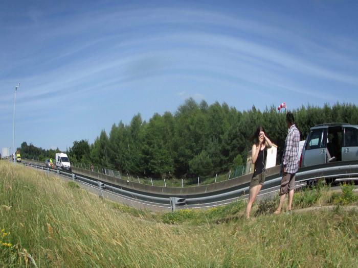 Пока думали-искали — несется супертехпомощь, типа наших реанимобилей, сигналит… Подъехал перец, весь в фирменной одежке, согнал нас за отбойник (мы про жилеты светоотражательные, конечно, и не вспомнили, посмотрел в капот, похоже ничего не понял, сбегал за разговорником, объяснил (с французского перевод текста заготовленными фразами на английский), что на месте не починим, но можно оттащить в соседний гараж и там устранить неисправность. Ну, а куда деваться? Димка уже и придумал снять с дашиной косметической кисточки металлическую трубочку и соединить через нее две трубки. Но не будешь же это делать при этом козле! Да еще без жилета — хотя мы в кармане, не на самой трассе стоим! Но место безлюдное, перевал в невысоких холмах, рядом мост через овраги… Цикады жужжат. Ляпота. Но +38. Потом обратили внимание, что на мост направлена камера, наверное, они нас просекли через нее. А может по джипиэс отслеживают как-то, их участок трассы.