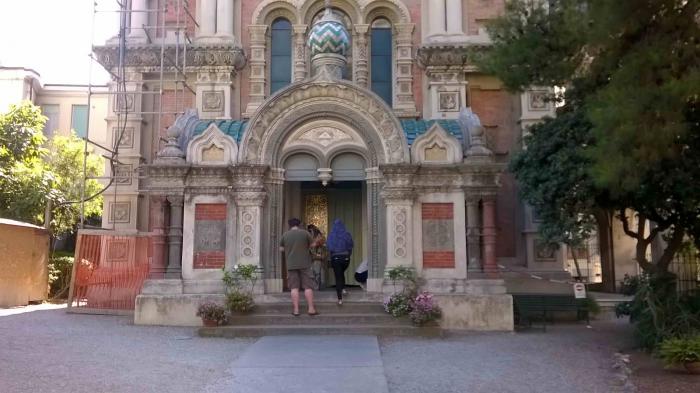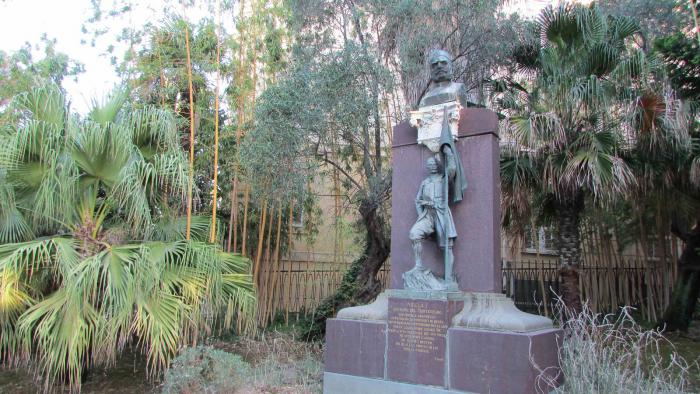 С утра еще немного прошлись по суматошному Санремо, подивились на пляжи в порту, среди моторов яхт, купаться не стали, помочили ноги в Лигурийском море, набрали песочку-камушков на память, зашли в русскую церковь, которую проектировал еще Щусев… Среди местных достопримечательностей тут называют еще виллу Нобеля, в которой создатель смертельного оружия любил отдыхать от трудов ( а может, именно здесь и трудился..), и ботанический сад –розарий. Все эти объекты показались скучноватыми. Вилла, правда, была закрыта, только внешне взглянули, а по саду побродили, скука смертная, полузасохшие клочки растений и таблички сведений о ботаниках рядом… Но в одном из местных скверов –парков наткнулась в зарослях бамбука на памятник: