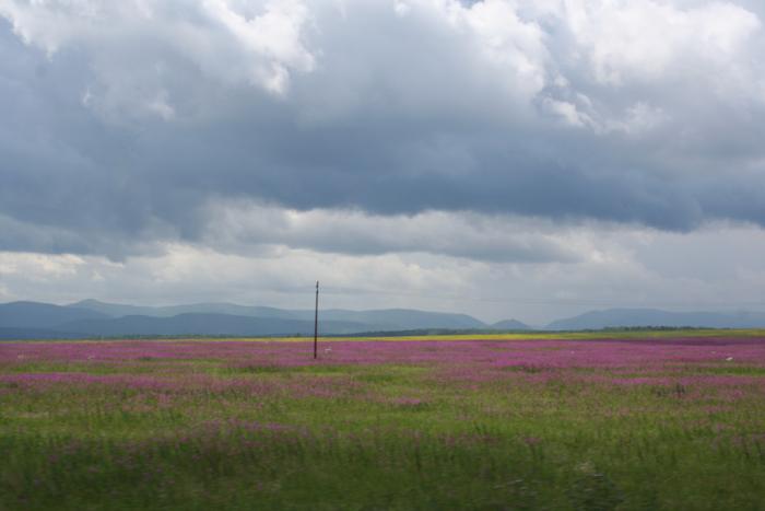 К счастью за всю поездку это и была самая неприятная ситуация, можно расслабиться. Едем дальше. Уже чаще попадаются праворульные машины. Дорога посредственная. Попадаются короткие (5-7 км), но совсем разбитые участки. Да и родные уже сердцу сотрудники ГИБДД попадаются чаще, через каждые 10-20 км. В основном дежурят под знаками ограничения скорости. Как уже было отмечено выше, иногда поставленными (или оставленными по халатности) незаконно. Спасает водительское братство. Проезжаем с какой положено скоростью и усердно отмигиваемся сами. Печально констатировать, но дороги по-прежнему везде по одной полосе в каждую сторону. Ну не должны машины на федеральной трассе мчаться друг на друга! А тут все время приходится совершать обгоны по встречной. Водители впереди идущих фур частенько помогают. Мой спутник отмечает, что мне помогают чаще. Хотя я сомневаюсь, что сквозь тонировку лобового стекла можно разглядеть мою женскую сущность. Или я слишком к ним прижимаюсь? Нервничают, вот и пропускают вперед? :)))))