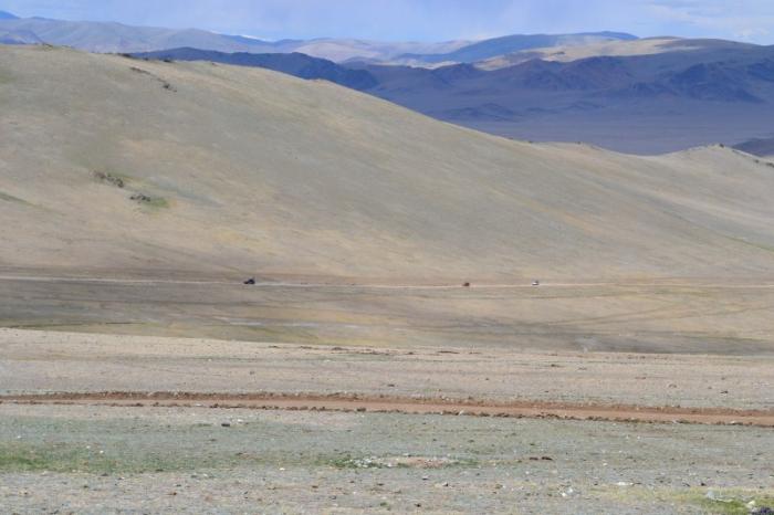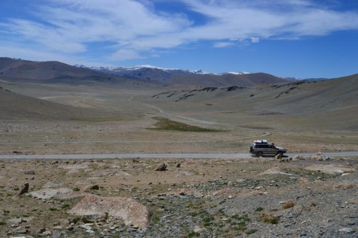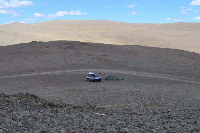 На перевальной точке сильный порывистый ветер, широкий обзор синеющих до самого горизонта горных вершин, пыльная серая лента оставшихся позади километров, да приткнувшийся к обочине УАЗ, который вторые сутки безуспешно пытается оживить галдящая кучка монголов. Подкинули им пару советов, ну и отправились на спуск.