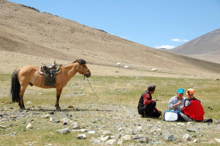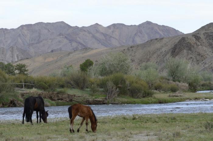 И лишь через несколько километров ниже наш путь стала сопровождать журчащая водная струя. На берегу этого небольшого ручья мы и устроились на скорый обед. Не успели вскрыть и пару банок консервов, как неизвестно откуда появился немолодой чабан на низкорослой монгольской лошадке и устроил нам интервью на смеси жестов и казахских слов. Из его рассказов узнали, что «джипы тут редко, но все-таки проезжают».