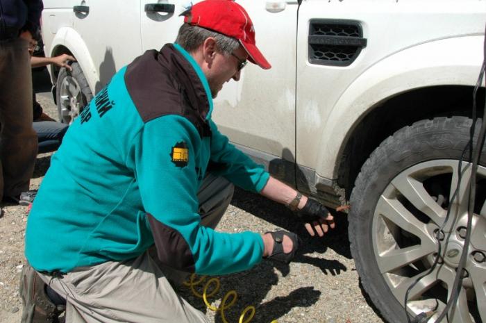 Совсем чуть-чуть не доезжая до цивилизованной дороги, получил пробой колеса «Дискавери». Так что, в аймачном центре, кроме получения пропусков, появилась необходимость проведения шиномонтажных работ.