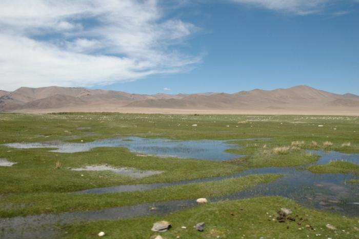 Возвращаться не захотелось и прямо через заболоченные солончаки двинулись в сторону высящейся на краю круглой долины горной гряды.