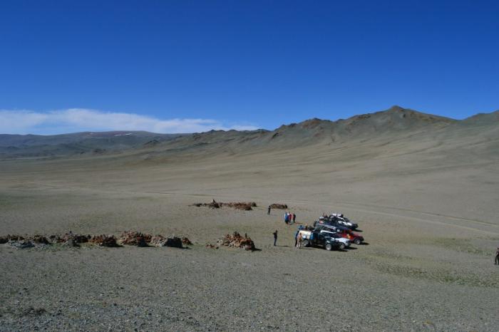 09.06.12. От северного берега озера Толбо федеральная трасса, подбираясь ко всегда снежной вершине Сайр, устремляется на северо-восток. Нить нашего же маршрута, свернув с основной дороги, уводит нас гораздо южнее, через перевалы хребта Мунх-Хайрхан к поселкам Булган и к китайской границе. Почти сразу за озером по постепенно сужающейся речной долине начинаем подниматься на пологий перевал Белийн-Дава (2400 м), на склонах которого встречаются древние каменные могильники.