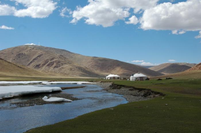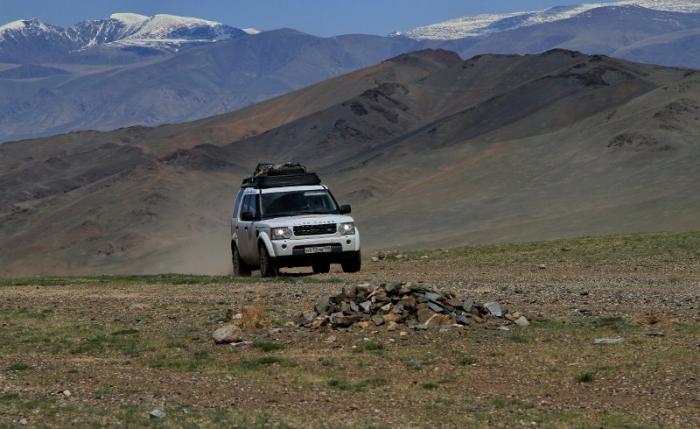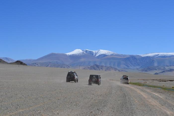 Город покинули в седьмом часу. Грейдер уверенно поднимал нас вверх по склону, карабкаясь на перевал с двойной вершиной (2200 м и 2250 м) Буквально через несколько километров после выезда из Баян-Ульгия пыльную «дорогу тысячелетия» перегородил шлагбаум. Рядом, в небольшой прокуренной кибитке расположился пункт сбора денег с проезжающих мимо автомобилей на финансирование этого векового дорожного проекта. Сильно не трезвый чиновник (видимо, мусульманские обычаи он соблюдает без положенного рвения) неожиданно предложил вместо означенных в прейскуранте 9000 тугриков за шесть единиц автотехники всего лишь 6000, как за оптовую покупку. Само собой сопротивляться я не стал.